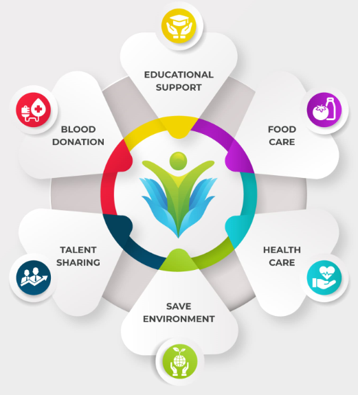 Helping our environment to maintain the Cleanliness, Educating peoples to follow road safety, Planting more trees to save the mother nature etc..